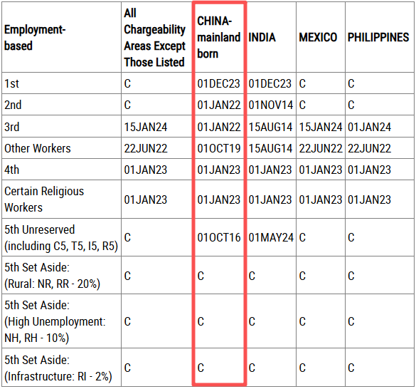 EB-5预留类别(乡村,高失业率地区以及基建项目):无排期。